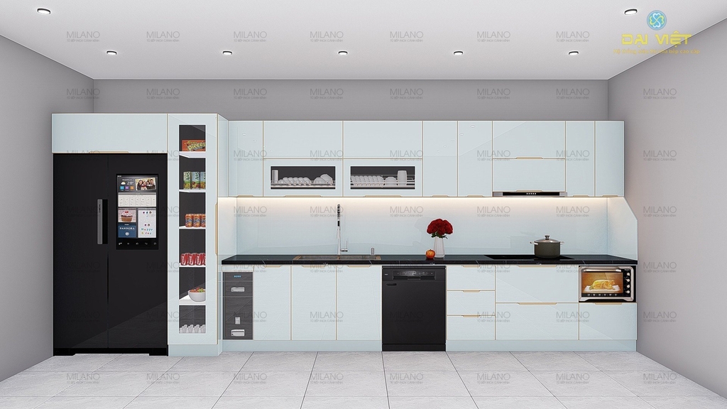 Ngoài phần khung xương inox thì tất cả những mặt còn lại đều được làm bằng kính với mặt trong và cánh tủ được ốp bằng kính mờ theo yêu cầu, lưng được Alumium. Và ngoài ra có thể thay kính lụa bằng kính sơn theo phong cách hoặc inox xước đẳng cấp đều rất đẹp và tiện dụng. Với mỗi loại kính lại mang đến vẻ đẹp khác nhau và có những phong cách riêng càng mang lại vẻ sang trọng quý phái cho căn bếp nhà bạn.