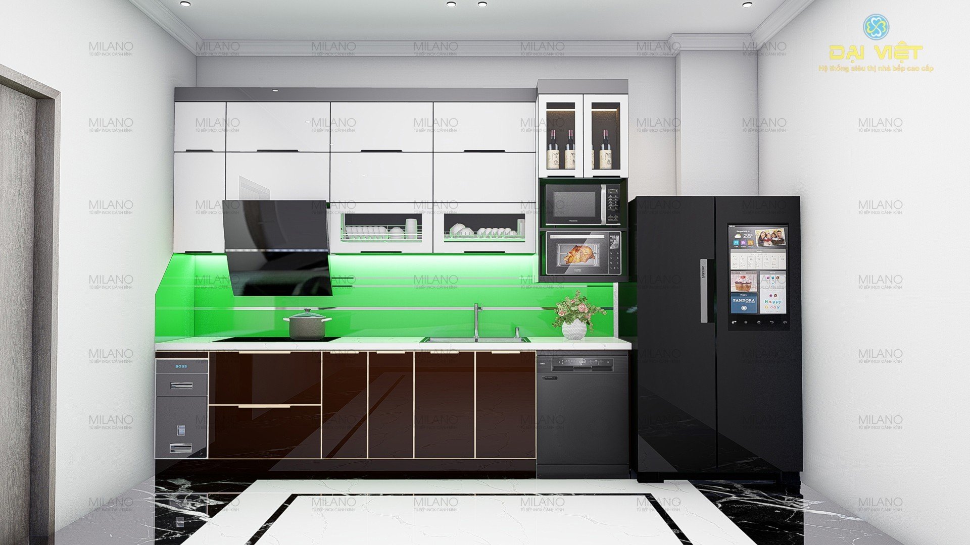 Ngoài phần khung xương inox thì tất cả những mặt còn lại đều được làm bằng kính với mặt trong và cánh tủ được ốp bằng kính mờ theo yêu cầu, lưng được Alumium. Và ngoài ra có thể thay kính lụa bằng kính sơn theo phong cách hoặc inox xước đẳng cấp đều rất đẹp và tiện dụng. Với mỗi loại kính lại mang đến vẻ đẹp khác nhau và có những phong cách riêng càng mang lại vẻ sang trọng quý phái cho căn bếp nhà bạn.