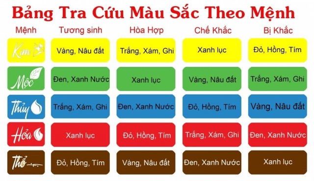 Ngoài ra thì các bạn cũng có thể lựa chọn màu sắc dựa theo ngũ hành tương sinh - tương khắc. Theo vào đó bạn có thể chọn màu của hệ tương sinh ra mệnh của mình, hạn chế chọn màu tương khắc của mình. Ví dụ như Thổ sinh Kim, người mệnh Kim có thể lựa chọn màu sắc của hệ Thổ, Hỏa khắc Kim, người mệnh kim không nên lựa chọn màu sắc của mệnh Hỏa.